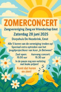 Alle 5 koren van onze vereniging laten weer van zich horen. Een speciaal optreden is er van ons koor In Between wat met een projectkoor enkele nummers ten gehore zal brengen. De zaal is open om 19:00 uur en in de pauze (van 20:30-21:00) zal er een verloting plaats vinden